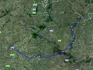 Починається від автотраси {{Автошлях E|105}} {{Автошлях М|18}}, одразу ж перетинає паралельну трасу {{Автошлях Р|51}}. Далі проходить через села Вільне, Андріївка, Дар-Надежда, Івано-Слиньківка, смт Сахновщина, села Степанівка, Миколаївка, Червона Долина, Артільне, Надеждине, {{Автошлях Р|51}}, Різдвянка, Садове, Благодатне, Тихопілля, Мечебилове, Нова Миколаївка, Степок, Грушуваха, Велика Комишуваха, Топольське, місто Ізюм {{Автошлях E|40}} {{Автошлях М|03}},{{Автошлях Р|78}}, села Гороховатка, Бойні, смт Борова, села Богуславка, Загризове, Кругляківка, Пристін, Петрівка, місто Куп'янськ {{Автошлях Н|26}}, села Кіндрашівка, Западне, смт Дворічна, селище Дворічне, села Тавільжанка, Жовтневе, Миколаївка, Піски і закінчується у Пісках (пункт контролю).