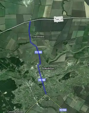 Починається в місті Вовчанськ {{Автошлях Т|2104}}, проходить коло села Плетенівка та закінчується на кордоні з Росією.