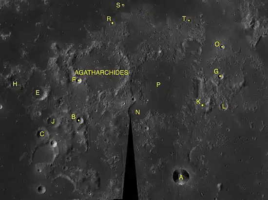 - Сателітний кратер Агатархід P перетинає тріщина, звана борозною Агатархіда.