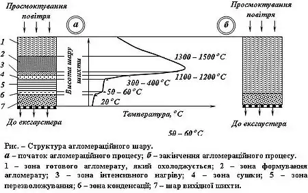 Принцип агломерації (рис. ) полягає в тому, що через шар дрібного рудного матеріалу змішаного з зернистим твердим паливом просмоктується повітря. Внаслідок цього зона горіння, де відбувається розм’якшення, плавлення рудного матеріалу і формування агломерату, безперервно переміщується вниз, упроваджується в неспечену шихту і залишає за собою шар готового агломерату. При спіканні шихта зазнає ряд складних різноманітних фізичних і хіміко-мінералогічних перетворень, які визначаються складом шихти і газової фази.