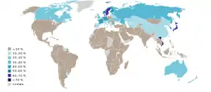 Частка атеїстів та агностиків у різних країнах. Значення для Китаю, Куби, Південної Кореї та В'єтнаму можуть бути неточними, оскільки щодо цих країн порівняно мало інформації.