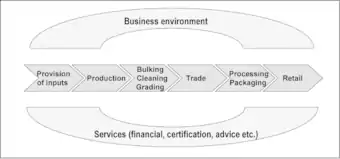 - міжнародного або регіонального ринку сировини та матеріалів. Приклади включають «глобальний ланцюжок вартості бавовни», «ланцюжок вартості південноафриканської кукурудзи» або «ланцюжок вартості бразильської кави»;