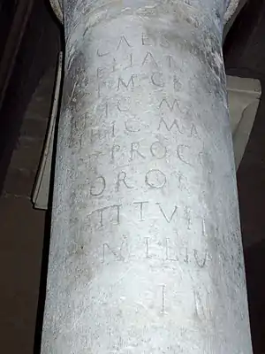 Переклад: Імператор Цезар Луцій Доміцій Аврелій, благочестивий, щасливий, непереможний, август, первосвященик, завойовник германців, готів, карпів, парфян, призначений трибуном ... разів, консулом ... разів, батько нації, проконсул, відновник загального миру. Поновив дорогу 3 (або 4) милі