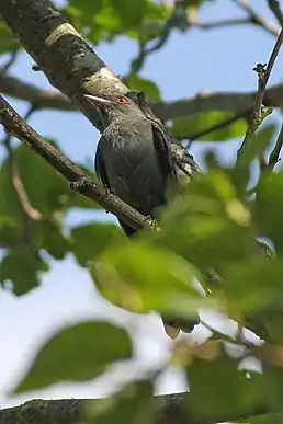 Довжина птаха становить 15 см. Самець має темно-сіре забарвлення з чорними крилами і хвостом, дзьоб у нього сірий, а очі червоні. Самичка має оливково-коричневе забарвлення, нижня частина тіла у неї світліша, поцяткована смужками.