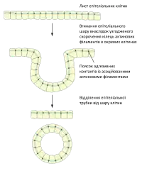 Адгезивні контакти забезпечують утворення широкої міжклітинної мережі із пучків скоротливих актинових філаментів, розташованих паралельно до мембран клітин і сполучених між собою за допомогою білків катенінів та кадгеринів. Така організація дозволяє не тільки протистояти механічному напруженню, а й узгоджувати поведінку клітин під час процесів морфогенезу. Наприклад, координоване скорочення кілець актинових філаментів сусідніх клітин є необхідним для формування трубок із листків епітелію, зокрема під час закладання нервової трубки[1]. Одним із прикладів є Shroom3-залежне скорочення зони прилипання, при цьому актин-зв'язуючий білок Shroom3 залучає до ділянки адгезивних контактів Rho кінази та активує міозин-II, внаслідок чого і відбувається скорочення[3].