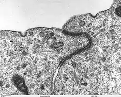 - Третім компонентом є пучки актинових філаментів у сусідніх клітинах непрямо сполучені між собою. Також був продемонстрований зв'язок адгезивних контактів із мікротрубочками, хоча значного їх скупчення у цих ділянках і не спостерігається. Мікротрубочки можуть приєднуватись до адгезивних контактів як плюс-, так і мінус-кінцями, разом із моторними білками вони, ймовірно, беруть участь у транспортуванні білків, необхідних для формування контактів, зокрема кадгеринів[3].