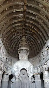 Храми — видовжені і вузькі приміщення у вигляді прямокутника з заокругленням наприкінці. Вузьке приміщення поділене на три нави, що нагадує європейцям розпланування базилік. Ширшою була лише центральна нава. Бічні нави використовувались для церемоніальної ходи і обходу чернецтвом ступи. Ступи — архітектурні споруди і водночас монументи для поховання, мали підмурки і напівсферичну форму. В них також розміщали прах померлого або якісь реліквії. Ступи просто неба могли мати великі розміри. Ступи в храмах Аджанти — навпаки, невеличкі. Храми (чайтья)- освітлені краще за монастирські приміщення, бо окрім освітлення через вхідний отвір мають додаткове — через велике вікно над вхідним порталом.