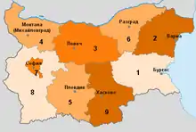 - Михайловградська область (з 1993 — Монтанська), — колишні округи Михайловград (з 1993 — Монтана), Відін, Враца