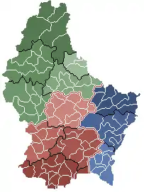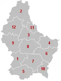 У адміністративному відношенні Велике Герцогство Люксембург поділяється на три округи (люксемб. Distrikter), які поділені на 12 кантонів, кантони поділяються на 116 комун, а комуни включають в себе окремі поселення: