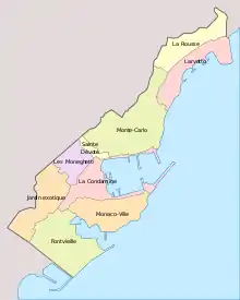 З 2013 року Монако поділяється на 9 адміністративних кварталів, 7 з яких мають статус постановлених кварталів, а 2 інші — захищених секторів[2]