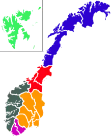 Норвегія складається з 5 основних неофіційних регіонів, 18 фюльке (районів), 422 комуни.