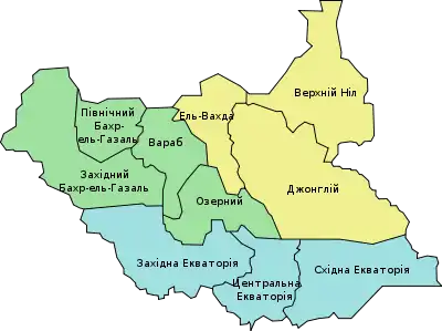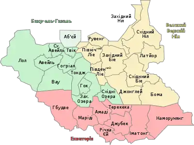 | 8 | 15 | Північний Бахр-ель-Газаль | شمال بحر الغزال | North Bahr-al-Ghazal | 33 558 | 1 491 359 | Авейль | Бахр-ель-Газаль |