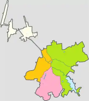Райони Сімферополя: помаранчевий — Залізничний, зелений — Київський, рожевий — Центральний; вище — 5 містечок, що підпорядковуються міській владі Сімферополя (Аерофлотський, Аграрне, Бітумне, Комсомольське, Гресівський).