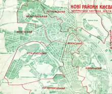 | Старокиївський | 1924 | 1917–1924 існував під назвами Міський, Центральний, Старокиївський. 1924–1992 — Ленінський район (у 1936 його печерська частина названа Кіровським районом) |