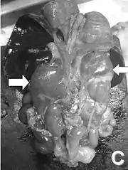 ![]() Розтин новонародженого. Стрілки показують збільшені наднирники через їхню гіперплазію Розтин новонародженого. Стрілки показують збільшені наднирники через їхню гіперплазію | |