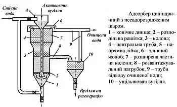 Після насичення адсорбенту поглиненою речовиною подачу стоків у колону припиняють і вугілля піддають регенерації. Очищення стічних вод активованим вугіллям у псевдорозрідженому завислому шарі здійснюється в циліндричних адсорберах. Циліндричний одноярусний адсорбер (рис. 2) являє собою колону 3 висотою 4 м. Діаметр верхньої частини колони збільшений. На розширеній частині колони 7 закріплений кільцевий зливний жолоб 6 для відводу очищеної води. У нижній частині колони передбачене конічне днище 1 з патрубками для подачі стічних вод на очищення. Над конічним днищем розташована розподільна решітка 2 з діаметром отворів 5 — 10 мм. На решітку завантажують активоване вугілля (висота його шару 2,5 — 2,7 м). У центрі колони передбачена труба 4 з напрямною лійкою 5 для подачі в колону активованого вугілля, яке дозують живильником.