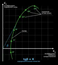 Поляра першого роду (зелений колір) демонструє залежність коефіцієнтів лобового спротиву і підіймальної сили від кута атаки. Дотична (синій колір) показує точку поляри, яка відповідає максимальній аеродинамічній якості.