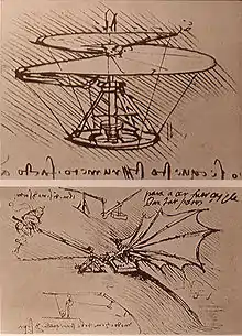 Леонардо да Вінчі продовжив своє дослідження птахів, розробивши проекти для деяких з найбільш ранніх літальних апаратів кінця XV століття, в тому числі крилатого орнітопера і вертольота. Хоча його проекти були раціональними, вони не були засновані на хорошій науці[10]. Багато з його конструкцій, такі як чотиримісний гвинтовий вертоліт, мають серйозні недоліки. Він, принаймні, зрозумів, що «об'єкт володіє таким же опором повітрю, як і повітря — об'єкту»[11]. (Ньютон не публікував Третій закон руху до 1687 року.)