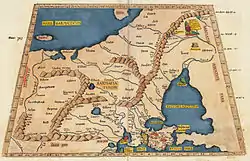 «В середині країни розташовані міста: Азагорій (56 ° - 50 ° 40), Амадока (56 ° - 50 ° 30), Сар (56 ° - 50 ° 15), Серим (57 ° - 50 °), Метрополь (56 ° - 49 ° 30)...» [1]