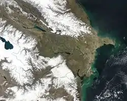 - Між горами Великого і Малого Кавказу чверть площі держави займає Кура-Араксинська низовина, частина якої лежить нижче рівня океану (до —28 м). Поділяється на Ширванський, Карабаський, Мільський, Муганський і Сальянський степи.
