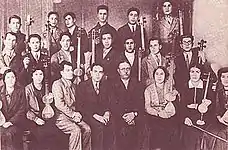 Узеїр Гаджибеков серед учасників створеного ним нотного оркестру азербайджанських народних інструментів (1932 рік)