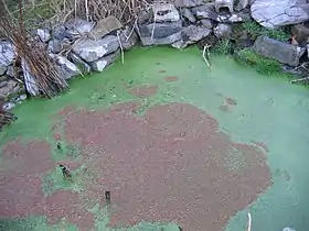 ![]() Азола каролінська (червоне) і ряска (зелене) у невеликому басейні | ||||||||||||||||||||||||||||