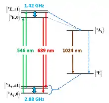 Оптичні збудження зберігають спіновий стан, але існує велика ймовірність станів, що розпадаються без випромінювання до синглетного стану, це явище називається міжсистемним перетином (ISC). Це відбувається з помітною швидкістю, оскільки крива енергії в залежності від положення атомів для стану перетинає криву для стану . Отже, протягом деякого моменту під час коливальної релаксації, яку зазнають іони після збудження, спін може перевертатися з невеликою енергією або відсутністю енергії, необхідної для переходу.[34] Важливо зазначити, що цей механізм також веде до переходу від до , але швидкість цього міжсистемного перетину набагато нижча, ніж станів , тому цей перехід позначається тонкою лінією. Діаграма також показує невипромінюючі та інфрачервоні конкуруючі шляхи розпаду між двома синглетними станами та тонке розщеплення в триплетних станах, різниця в енергії яких відповідає мікрохвильовим частотам.