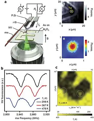 Використовуючи той самий механізм, NV--центри використовувались в скануючої термічної мікроскопії для вимірювання просторових карт температури та теплопровідності з високою роздільною здатністю (див. Зображення).[36]