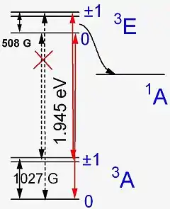 Загалом NV--центр має триплет основного стану (3A), триплет збудженого стану (3E) і синглет проміжного стану (1A).[20] І 3A, і 3E містять спінові стани ms=±1, де спіни двох електронів вирівняні (або вгору, так що ms=+1 або вниз, так що ms=-1), і спіновий стан ms=0, коли спіни електрів є антипаралельними. Завдяки магнітній взаємодії енергія стану ms=±1 вища, ніж енергія стану ms=0. Однак 1A, містить лише синглет спинового стану зі спіном 0. Якщо зовнішнє магнітне поле прикладене вздовж осі дефекту (осі, що перетинає атом азоту та вакансію) NV−-центра, це не впливає на стан ms= 0, але розділяє ms =±1 рівні (ефект Зеемана).