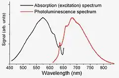 NV--центри випромінюють яскраво-червоне світло, яке може бути зручно збуджуватися видимими джерелами світла, такими як аргоновий або криптоновий лазери, Nd:YAG-лазери з подвоєнням частоти, лазери на барвниках або He-Ne лазери. Збудження також може бути досягнуто при енергіях нижче енергії нульового випромінювання фононів.[16] Однак лазерне освітлення також перетворює деякі NV- в NV0-центри.[4] Випромінювання відбувається дуже швидко (час релаксації ~ 10 нс).[17][18] При кімнатній температурі різких піків не спостерігається через термічне розширення. Однак охолодження NV — -центрів за допомогою рідкого азоту або рідкого гелію різко звужує лінії до ширини в кілька мегагерц.