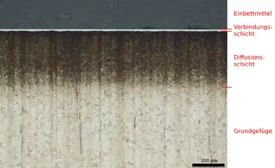 Антикорозійному азотуванню (температура 600…700 °С) піддають також вироби з вуглецевої сталі з утворенням азотованого шару завтовшки 0,01…0,04 мм при витримуванні у печі протягом 15 хв для дрібних деталей і до 10 год — для великих[2].