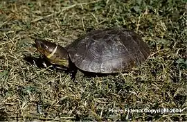 Голова забарвлена у коричневий або чорний кольори з різними відтінками. Карапакс коричневий. Шкіра темно-коричневого забарвлення. Пластрон жовтуватий.