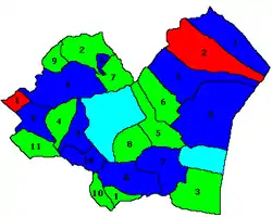 Округ розділений на 23 політичні громади (2 міські, 10 ярмаркових та 11 без статусу).