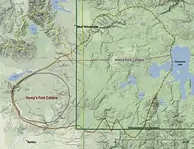 На південний захід від кальдери лежить плато Снейк-Рівер, східна частина якого утворена в результаті зсуву Єллоустонської гарячої точки у північно-східному напрямку, що відбувалося протягом 17 мільйонів років[3]. Центральна і східна долини плато складаються з товстих шарів вулканічного туфу, покритих тонким шаром базальту. До інших об'єктів вулканічного походження на плато відносять, наприклад, Місячні кратери. З кальдери видно гірські піки хребта Титон, який знаходиться на південний схід від Айленд-Парк.
