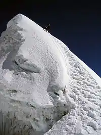Підйом від Attack camp починається прямо вгору в скельний кулуар. Спочатку підйом йде по лівій стороні кулуара впритул до скель, потім стежка переходить на праву сторону. Місцями стоять тури. Є майданчики під намети. Далі шлях губиться в осипах, орієнтуватися потрібно по турах. Осипний гребінь виводить до льодовика. Шлях по льодовику петляє між тріщин, але народу ходить багато і зазвичай є хороша стежка, яка приводить під крутий сніжний схил. У сезон схил провішаний перилами до виходу на вершинний гребінь. Перил — 3-4 мотузки. Вийшовши на гребінь вправо вгору 100 м по вузькому гребеню до вершини. Спуск по шляху підйому.