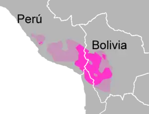 ![]() Темний колір: нинішнє поширення аймарських мов. Світлий колір: колишнє поширення. | |
