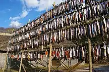 Молока (up) та ікра лосося (cipor), отримані при потрошінні риби також сушилися, а потім використовували в sayo або для ohaw.[7]