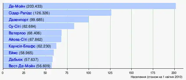 Незважаючи на сформовану думку про Айову як про один з «сільських» штатів США, більшість населення штату (понад 60 %) проживає в містах. Найбільші міські агломерації на території Айови утворилися навколо столиці штату, Де-Мойн (близько 575 тисяч осіб) та Давенпорту (близько 380 000 осіб).