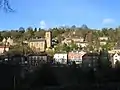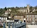 Вид на Айронбридж із Залізного мосту. Праворуч — готель Тонтіне, нагорі видно айронбриджську церкву