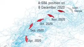 4 листопада 2020 року повідомлялося, що A-68A досягнув острова Південна Джорджія.