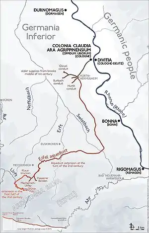 Акведук Айфель був побудований у північній частині регіону. Будували його з каменю та бетону, у формі арки. Його максимальна пропускна здатність становила 20 000 м³ питної води в день. Вода з акведука Айфель використовувалися для живлення фонтанів, лазень і приватних будинків. Акведук без перерв використовувався аж до 260 року, коли він був частково зруйнований під час перших набігів германських племен. Після цього його так і не відновили, а Colonia Claudia Ara Agrippinensium отримувала воду тільки від акведука Форгебірге.