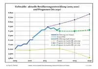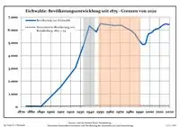 Динаміка населення з 1875 року в сучасних кордонах (Синя лінія: населення; Пунктир: відносна порівняльна динаміка населення землі Бранденбург; Сірий фон: період Третього рейху; Помаранчевий фон: період НДР)