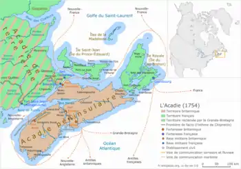 Французька колонія Акадія почалася 1604 року із побудовою міста Порт-Рояль (тепер — Анаполіс у Новій Шотландії). У середині XVIII століття Акадія перейшла під контроль Англії. 1755 року акадійців примусово депортовали, щоб не мати «п'ятої колони» та розчистити місце для британських колоністів. Депортація відбувалася у жахливих умовах: значна частина депортованих загинула від хвороб через погану санітарію на кораблях.
