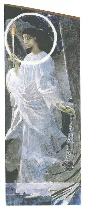 Він довго не полишав акварелі й в роки праці в Києві. У техніці акварелі виконані його ескізи до стінописів у Володимирському соборі — «Янгол зі свічкою», два варіанти «Воскресіння Господнього», чотири варіанти «Надгробного плачу». Тільки слабкий зв'язок з тодішніми канонічними схемами та інтриги Прахова завадили перевести ескізи у фрески.