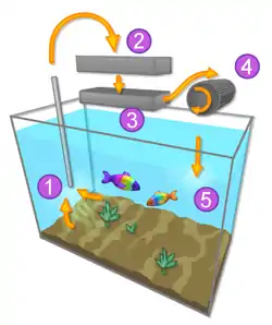Забезпечення чистоти води, має важливе значення для охорони здоров'я акваріумних рибок. Адже залишки кормів та фекалії є поживним субстратом для розмноження мікроорганізмів, в тому числі і патогенних, які безпосередньо можуть вражати риб. Окрім того, у процесі життєдіяльності мікроорганізми виділяють у воду токсини, наприклад, аміак, які можуть призводити до отруєння і загибелі риб. Для запобігання небажаних оказій розроблено системи фільтрації води. Існують механічні та хімічні фільтри. У домашніх акваріумах застосовуються, майже виключно, механічні, що очищують воду від завислих механічних часток, які затримуються на пористих фільтрувальних елементах. Відфільтрована вода повертається у акваріум.