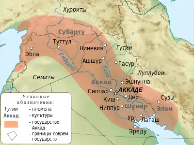 Аккадська держава виникла внаслідок завойовницьких походів Саргона Стародавнього, який об'єднав під своєю владою землі шумерів та східних семітів (згодом аккадців), включивши в свої володіння всі номи Стародавньої Месопотамії і ряд сусідніх територій. Найвищої могутності Аккад досяг при онуці Саргона, Нарам-Суені, але вже наприкінці XXIII ст. до н. е.. держава занепала, а її основна територія потрапила під владу гірських племен Гутіїв.