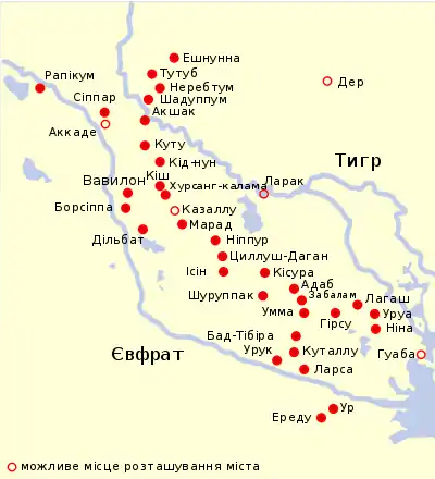 Приблизно на початку III тисячоліття до н. е. на землі Верхньої Месопотамії, імовірно з Аравійського півострова, переселяються східні семіти — пращури аккадців[13]. З часом вони переймають у шумерів письменність, пристосувавши її під свою мову, а також міфологію і спосіб життя. Перші аккадські імена в Месопотамії з'являються в XXVII столітті до н. е. Семіти складали більшість населення в верхів'ях Тигра і середній течії Євфрату — містах Марі, Ашшур, Ніневія. В районі Кіша і Ніппура населення було змішаним, на південь від Ніппура було більше шумерів.