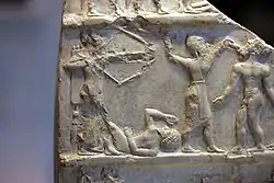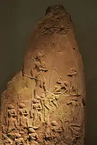 Значних успіхів аккадські майстри досягли в виготовленні рельєфів. Найкращі пам'ятники — кам'яні стели царів Рімуша і Нарам-Суена. Стелу Нарам-Суена — знайшли в Сузах, столиці Еламу, куди її привіз еламський цар Шутрук-Наххунте з Сіппару як трофей. Вона була створена за наказом царя Нарам-Суена на честь його перемоги над гірським плем'ям луллубеїв. В композиції виділена фігура царя, який стоїть над військами і топить своїх ворогів. Цар оточений символами божеств, голова його вкрита головним убором з рогами, які засвідчують, на думку аккадців, про його власне божественне походження[62]. Стела Рімуша збереглась фрагментарно. Вона також розповідає про воєнні перемоги царя. Сам Рімуш зображений в бахромчатому одягу з натягнутим луком, мабуть, беручи участь у побитті полонених.