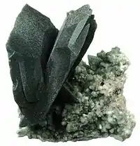 Chloritized bladed crystals of Axinite forming on Adularia from the Swiss Alps
