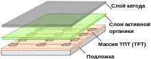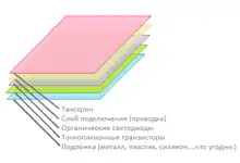 Верхній шар — сенсорний екран. Його приклеєно до другого шару — прозорого захисного шару, на якому також розміщена проводка(дротяна сітка для передачі струму низької напруги). Проводка приєднана до шару зі світлодіодами — вони формують зображення. Під світлодіодами розташовується шар тонкоплівкових транзисторів (TFT). Під ними розташована підкладка, яка може бути виготовлена з багатьох матеріалів, в тому числі й гнучких.